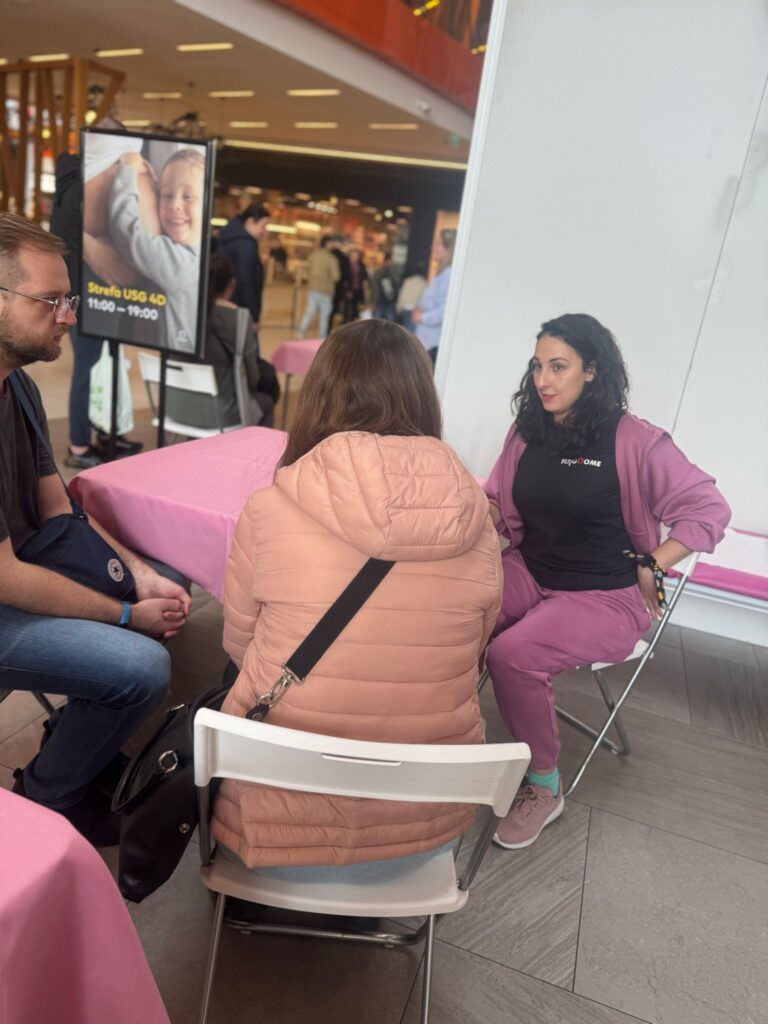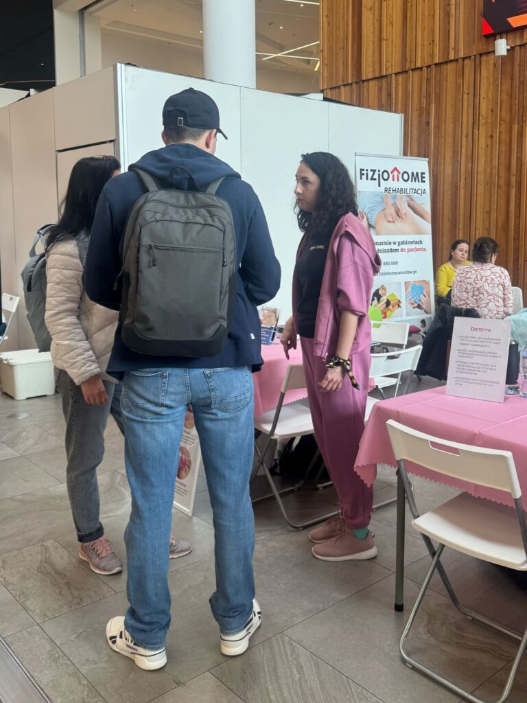 Nasza fizjoterapeutka, Maja, z ogromnym zaangażowaniem opowiadała o fizjoterapii urologicznej, uroginekologicznej oraz możliwościach leczenia dolegliwości układu ruchu. Uczestnicy mieli okazję dowiedzieć się więcej, zadać pytania, a nawet… poćwiczyć na środku galerii handlowej!